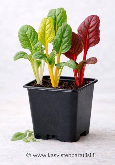 Värikäs ja näyttävä luomulehtivihannes. Samassa ruukussa on eri värisiä mangoldeja. Sopii salaatteihin, wokkeihin ja kypsennettäväksi. Taimia per ruukku noin 5–15 kpl.